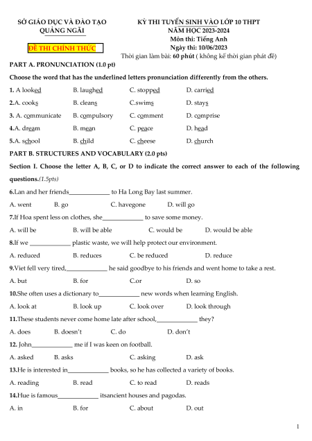 KỲ THI TUYỂN SINH VÀO LỚP 10 THPT QUẢNG NGÃI NĂM HỌC 2023-2024 Môn thi: Tiếng Anh ĐỀ THI CHÍNH THỨC Ngày thi: 10/06/2023