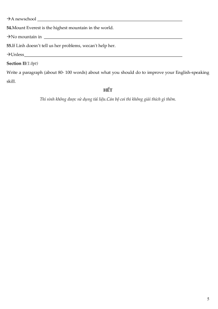 Thí sinh không được sử dụng tàỉ liệu.Cán bộ coi thi không giải thích gì thêm.