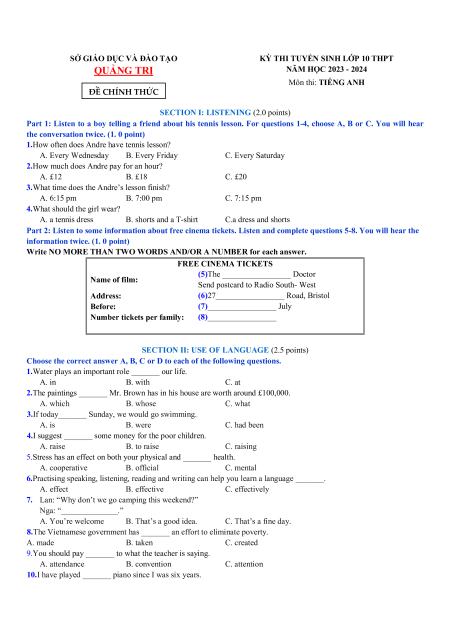 KỲ THI TUYỂN SINH LỚP 10 THPT QUẢNG TRỊ NĂM HỌC 2023 - 2024 Môn thi: TIẾNG ANH ĐỀ CHÍNH THỨC