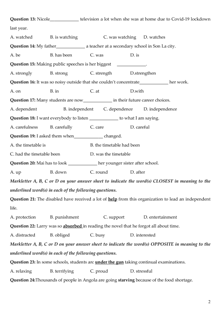 Question 13: Nicole_____________ television a lot when she was at home due to Covid-19 lockdown last year. A. watched B. is watching C. was watching D. watches