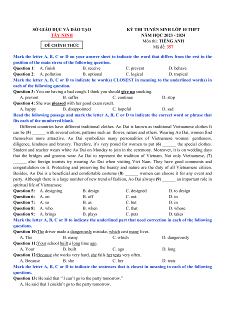 KỲ THI TUYỂN SINH LỚP 10 THPT TÂY NINH NĂM HỌC 2023 - 2024 Môn thi: TIẾNG ANH ĐỀ CHÍNH THỨC Mã đề: 357