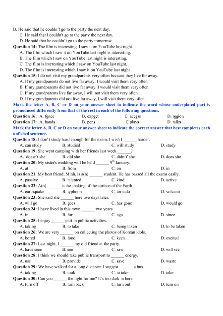 Question 23: She said she ______ here two days later. A. will go B. goes C. has gone D. would go