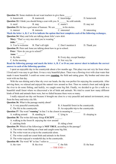 Question 40: The word “it” in line 7 refers to _______. A. the view B. the river C. the fish D. the boat --- THE END ---