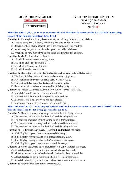 KỲ THI TUYỂN SINH LỚP 10 THPT THỪA THIÊN HUẾ NĂM HỌC 2023 - 2024 Môn thi: TIẾNG ANH ĐỀ CHÍNH THỨC Mã đề: 117