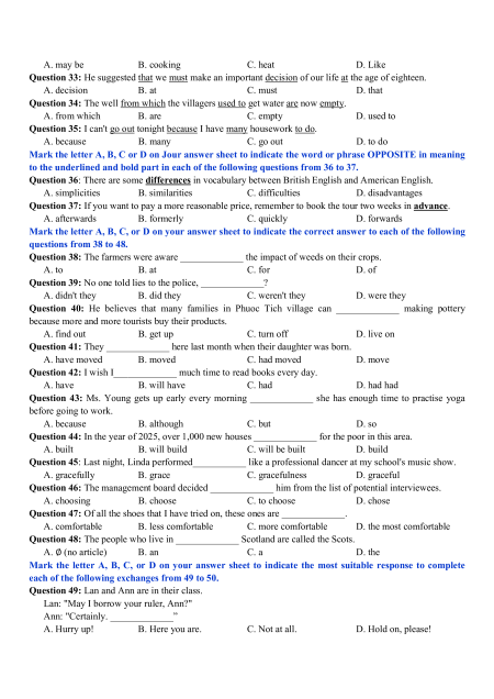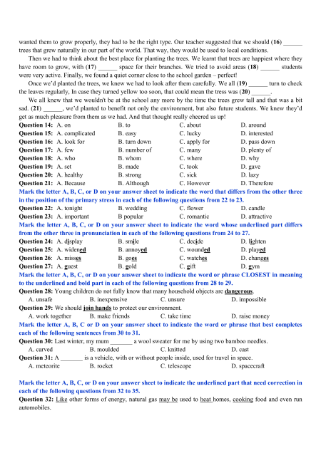 get as much pleasure from them as we had. And that thought really cheered us up! Question 14: A. on B. to C. about D. around Question 15: A. complicated B. easy C. lucky D. interested Question 16: A. look for B. turn down C. apply for D. pass down Question 17: A. few B. number of C. many D. plenty of Question 18: A. who B. whom C. where D. why Question 19: A. set B. made C. took D. gave Question 20: A. healthy B. strong C. sick D. lazy Question 21: A. Because B. Although C. However D. Therefore