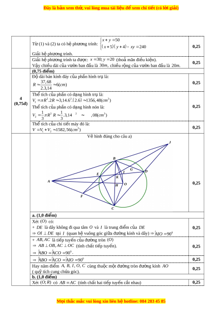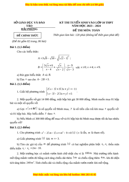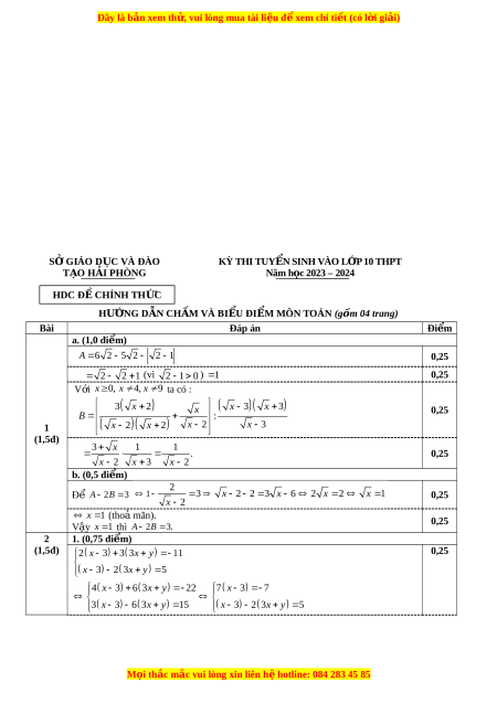 Đây là bản xem th , vu ử i lòng mua tài li u ệ đ xe ể m chi ti t ế (có l i ờ gi i ả ) S Ở GIÁO D C Ụ VÀ ĐÀO KỲ THI TUY N Ể SINH VÀO L P Ớ 10 THPT TẠO NĂM H C Ọ 2023 – 2024 HẢI PHÒNG Đ Ề THI MÔN: TOÁN Đ C Ề HÍNH TH C Ứ Th i
