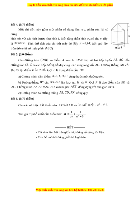 Đây là bản xem th , vu ử i lòng mua tài li u ệ đ xe ể m chi ti t ế (có l i ờ gi i ả ) Bài 4. (0,75 đi m ể ) M t ộ chi ti t ế máy g m ồ m t ộ ph n ầ có d ng ạ hình tr , ụ ph n ầ còn l i ạ có dạng hình nón v i ớ các kích thư c ớ nh ư hình 1. Bi t ế r n ằ g ph n ầ hình tr ụ có chu vi đáy