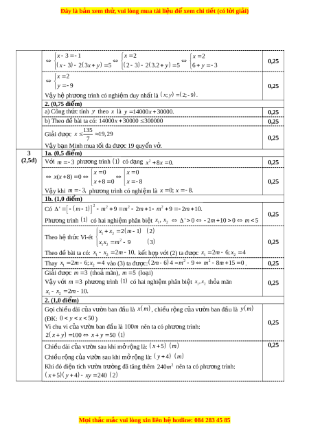 b) Theo đề bài ta có: 14000x 30000 3 00000 0,25 135 Giải đư c ợ x 1 9, 29 7 0,25 Vậy bạn Minh mua t i ố đa đư c ợ 19 quy n v ể . ở 3 1a. (0,5 đi m) ể (2,5đ) V i ớ m 3 phư ng ơ trình 1 có dạng 2 x 8x 0 . 0,25 x 0 x 0 x(x 8) 0 x 8 0 x 8 0,25