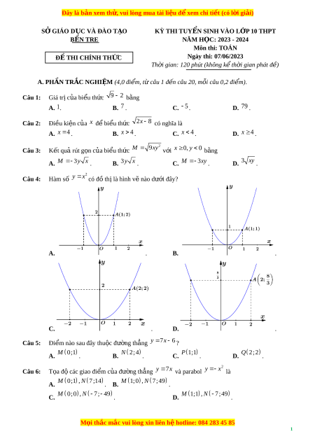 Đây là bản xem th , vu ử i lòng mua tài li u ệ đ xe ể m chi ti t ế (có l i ờ gi i ả ) SỞ GIÁO D C Ụ VÀ ĐÀO T O Ạ KỲ THI TUY N Ể SINH VÀO L P Ớ 10 THPT B N Ế TRE NĂM HỌC: 2023 - 2024 Môn thi: TOÁN Đ Ề THI CHÍNH TH C Ngày thi: 07/06/2023 Ứ Th i