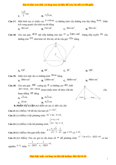 Đây là bản xem th , vu ử i lòng mua tài li u ệ đ xe ể m chi ti t ế (có l i ờ gi i ả ) 7 3 cm C. 3 . D. 7 3 cm . Câu 17: M t ộ hình trụ có chi u ề cao h 1 0 cm và đư ng ờ kính của đư ng ờ tròn đáy b ng ằ 6cm . Di n ệ