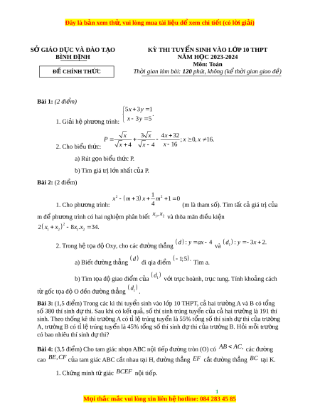 Ể SINH VÀO LỚP 10 THPT BÌNH Đ N Ị H NĂM HỌC 2023-2024 Môn: Toán ĐỀ CHÍNH TH C Ứ Th i