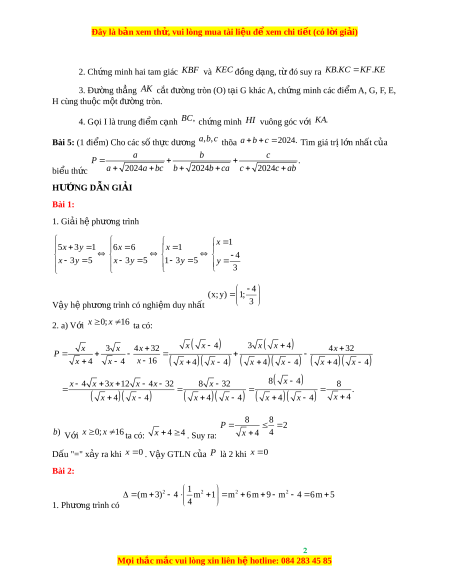 c 2024c ab HƯ N Ớ G D N Ẫ GI I Ả Bài 1: 1. Giải h ph ệ ư ng ơ trình x 1 5 x 3y 1 6x 6 x 1 4 x 3y 5 x 3y 5 1 3y 5 y 3 4 (x; y) 1; Vậy h ph ệ ư ng t ơ rình có nghi m ệ duy nhất 3 2. a) V i ớ x 0 ; x 1 6 ta có: x x x x x 4 3 x x 4 3 4 32 4x 32 P x 4 x 4 x 16