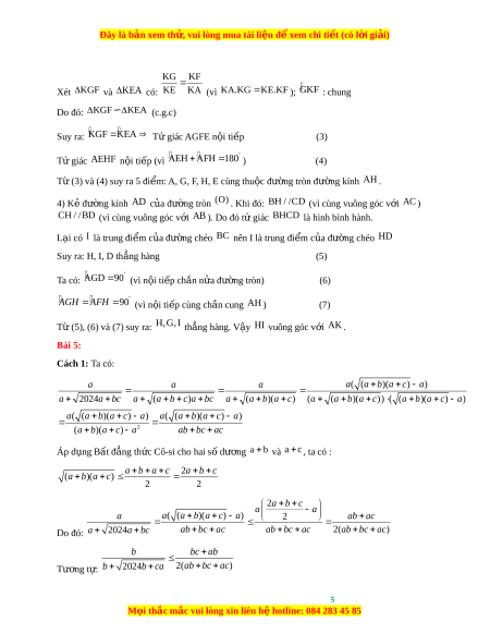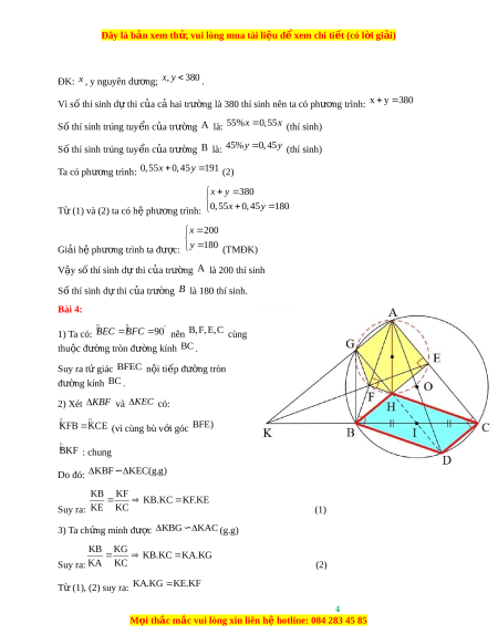 ờ B là 180 thí sinh. Bài 4: 1) Ta có: BEC BFC 90 nên B, F, E,C cùng thuộc đư ng ờ tròn đư ng kí ờ nh BC . Suy ra tứ giác BFEC n i ộ tiếp đư ng ờ tròn đư ng ờ kính BC . 2) Xét K BF và K EC có: KFB K CE (vì cùng bù v i ớ góc BFE) BKF : chung Do đó: K BF K ∽ EC(g.g) KB KF KB.KC K F.KE Suy ra: KE KC (1) 3) Ta ch ng ứ minh được K BG K ∽ AC (g.g) KB KG KB.KC K A.KG Suy ra: KA KC (2) Từ (1), (2) suy ra: KA.KG K E.KF 4 M i ọ thắc m c