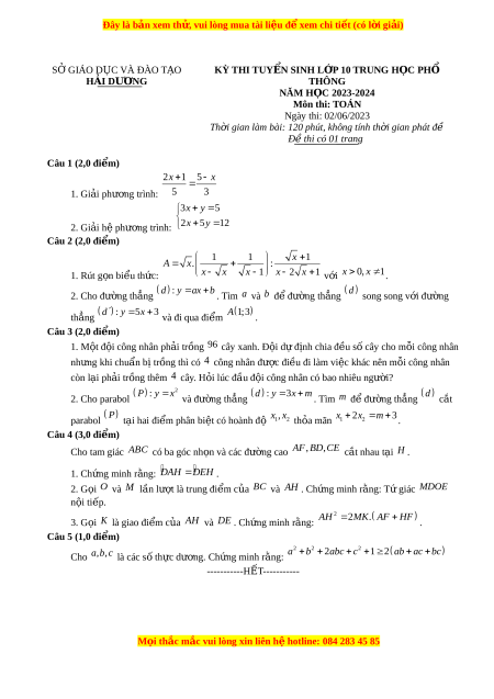 Đây là bản xem th , vu ử i lòng mua tài li u ệ đ xe ể m chi ti t ế (có l i ờ gi i ả ) S G Ở IÁO D C Ụ VÀ ĐÀO T O Ạ KỲ THI TUY N Ể SINH L P Ớ 10 TRUNG H C Ọ PHỔ H I Ả DƯ N Ơ G THÔNG NĂM H C Ọ 2023-2024 Môn thi: TOÁN Ngày thi: 02/06/2023 Th i