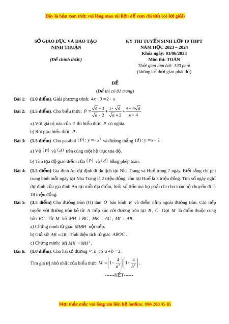 Đây là bản xem th , vu ử i lòng mua tài li u ệ đ xe ể m chi ti t ế (có l i ờ gi i ả ) SỞ GIÁO D C Ụ VÀ ĐÀO T O Ạ KỲ THI TUY N Ể SINH L P Ớ 10 THPT NINH THU N Ậ NĂM H C Ọ 2023 – 2024 Khóa ngày: 03/06/2023 (Đ c ề hính th c ứ ) Môn thi: TOÁN Th i