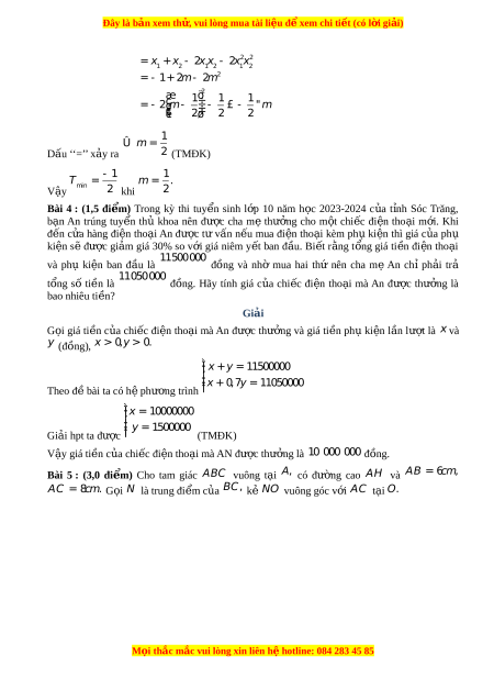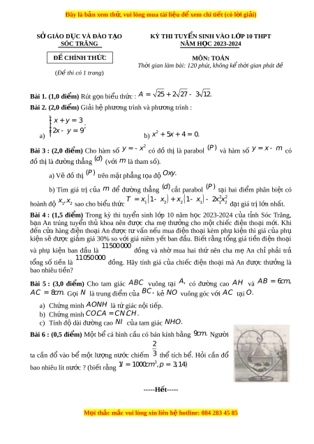 Đây là bản xem th , vu ử i lòng mua tài li u ệ đ xe ể m chi ti t ế (có l i ờ gi i ả ) SỞ GIÁO D C Ụ VÀ ĐÀO T O Ạ KỲ THI TUY N Ể SINH VÀO L P Ớ 10 THPT SÓC TRĂNG NĂM HỌC 2023-2024 Đ Ề CHÍNH TH C Ứ MÔN: TOÁN Th i