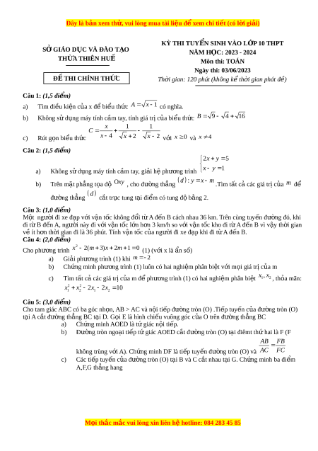 Đây là bản xem th , vu ử i lòng mua tài li u ệ đ xe ể m chi ti t ế (có l i ờ gi i ả ) KỲ THI TUY N Ể SINH VÀO L P Ớ 10 THPT SỞ GIÁO D C Ụ VÀ ĐÀO T O Ạ NĂM HỌC: 2023 - 2024 THỪA THIÊN HUẾ Môn thi: TOÁN Ngày thi: 03/06/2023 Đ Ề THI CHÍNH TH C Ứ Th i