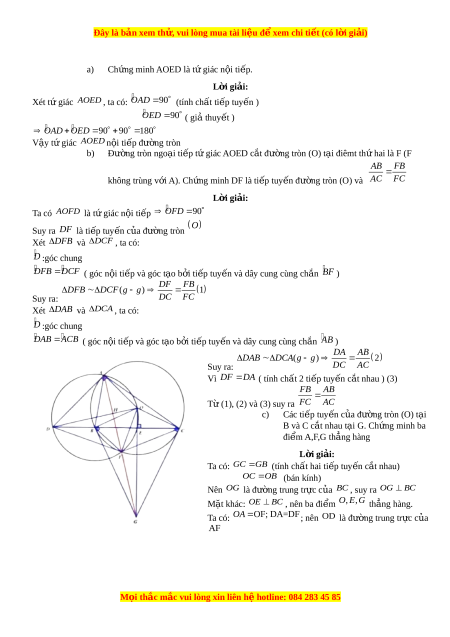 ọ E là hình chi u vuông góc ế c a ủ O trên đư ng t ờ h ng BC ẳ a) Ch ng ứ minh AOED là t gi ứ ác n i ộ ti p. ế b) Đư ng t ờ ròn ngoại ti p t ế ứ giác AOED c t ắ đư ng t ờ ròn (O) t i ạ điêmt th ha ứ i là F (F AB FB không trùng v i ớ A). Ch ng ứ minh DF là ti p ế tuy n đ ế ư ng t ờ ròn (O) và AC FC c) Các ti p t ế uy n c ế ủa đư ng ờ tròn (O) t i ạ B và C c t ắ nhau t i ạ G. Ch ng m ứ inh ba đi m ể A,F,G thẳng hang M i ọ thắc m c
