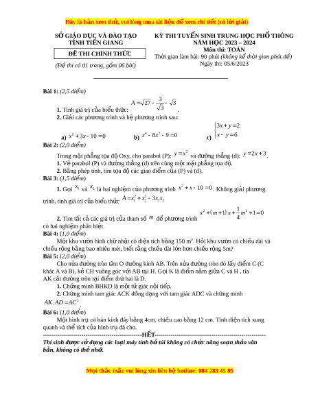 - Tailieugiaovien.com.vn giới thiệu Đề thi chính thức môn Toán vào 10 Tỉnh Tiền Giang năm 2023-2024 nhằm giúp Giáo viên có thêm tài liệu tham khảo ra đề thi Toán vào 10.