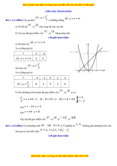 ( )d :y = x + 4 Bài 1. (1,5 đi m) ể Cho parabol 2 và đư ng ờ thẳng . (P ) ( )d a) V đ ẽ t ồ hị và trên cùng h t ệ r c ụ t a ọ đ . ộ (P ) ( )d b) Tìm t a ọ độ giao đi m ể c a ủ và bằng phép tính. L i ờ giải tham kh o ả