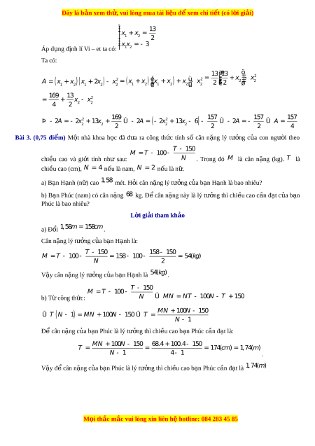 A = (x +x x +2x - x 1 2) ( 1 2) 2 tính giá trị c a ủ bi u t ể h c ứ 2 . Bài 3. (0,75 đi m) ể M t ộ nhà khoa h c ọ đã đ a ư ra công th c ứ tính số cân n ng ặ lý tư ng ở c a ủ con ngư i ờ theo T - 150 M =T - 100- chiều cao và gi i ớ tính như sau: N