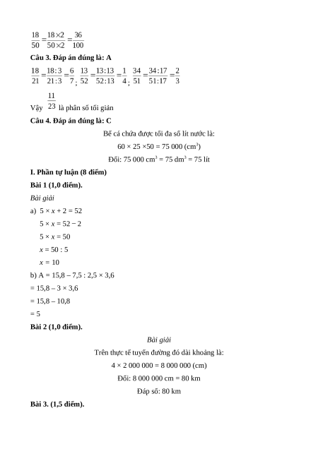 b) A = 15,8 – 7,5 : 2,5 × 3,6 = 15,8 – 3 × 3,6 = 15,8 – 10,8 = 5 Bài 2 (1,0 điểm). Bài giải
