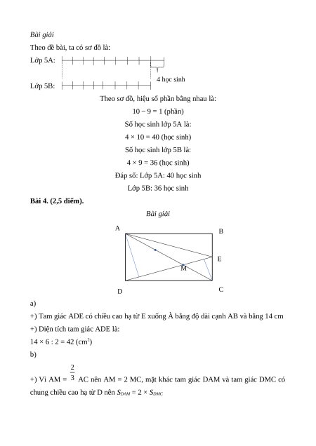 Đáp số: Lớp 5A: 40 học sinh Lớp 5B: 36 học sinh Bài 4. (2,5 điểm). Bài giải A B E M D C a)