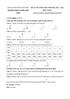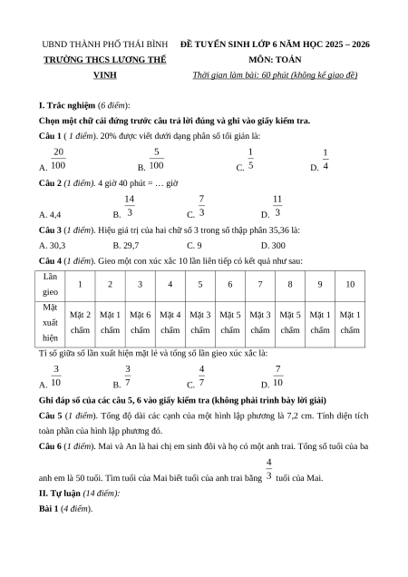 Đề thi vào lớp 6 môn Toán trường Lương Thế Vinh - Thái Bình 2025 có đáp án