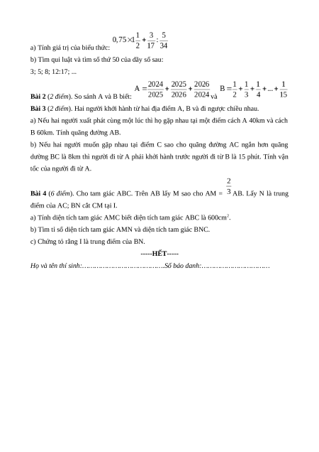 Bài 4 (6 điểm). Cho tam giác ABC. Trên AB lấy M sao cho AM = AB. Lấy N là trung