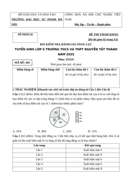 TUYỂN SINH LỚP 6 TRƯỜNG THCS VÀ THPT NGUYỄN TẤT THÀNH NĂM 2025 Môn: TOÁN MÃ ĐỀ: 601