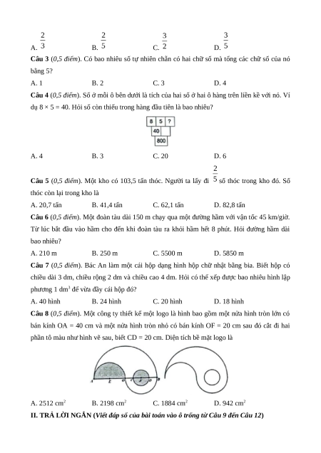II. TRẢ LỜI NGẮN (Viết đáp số của bài toán vào ô trống từ Câu 9 đến Câu 12)
