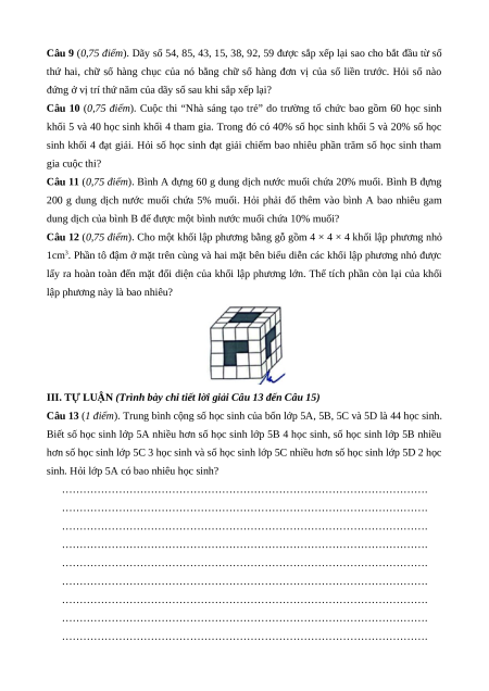 Câu 12 (0,75 điểm). Cho một khối lập phương bằng gỗ gồm 4 × 4 × 4 khối lập phương nhỏ