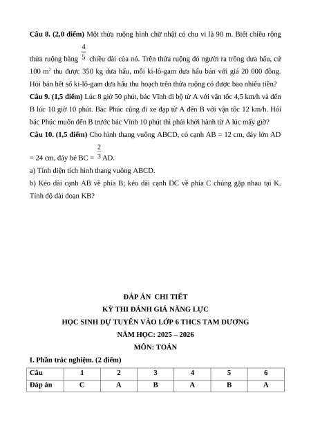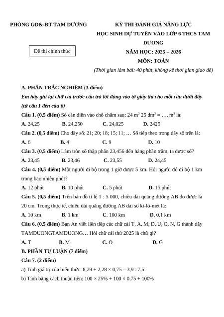 HỌC SINH DỰ TUYỂN VÀO LỚP 6 THCS TAM DƯƠNG Đề thi chính thức