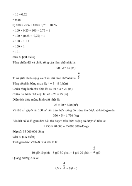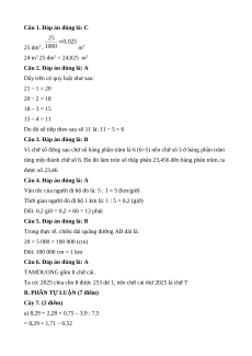 = 100 × 0,25 + 100 × 0,75 + 1 = 100 × (0,25 + 0,75) + 1 = 100 × 1 + 1 = 100 + 1 = 101 Câu 8. (2,0 điểm)