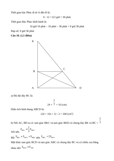Câu 9. (1,5 điểm) Lúc 8 giờ 50 phút, bác Vĩnh đi bộ từ A với vận tốc 4,5 km/h và đến