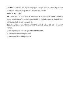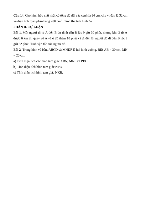 Câu 14. Cho hình hộp chữ nhật có tổng độ dài các cạnh là 84 cm, chu vi đáy là 32 cm