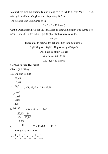 1.1. Đặt tính rồi tính a) ; Vậy 27,45 +1,26 = 28,71 b) ; Vậy 5,64 : 2,5 = 14,1 c) ;Vậy 135,63 : 9 = 15,07