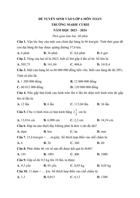 ĐỀ TUYỂN SINH VÀO LỚP 6 MÔN TOÁN TRƯỜNG MARIE CURIE