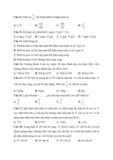 Câu 11. Phân số 5 viết thành phân số thập phân là: 4 A. 1,25 B. 125 C. 100 D. 1 1 100 80 4