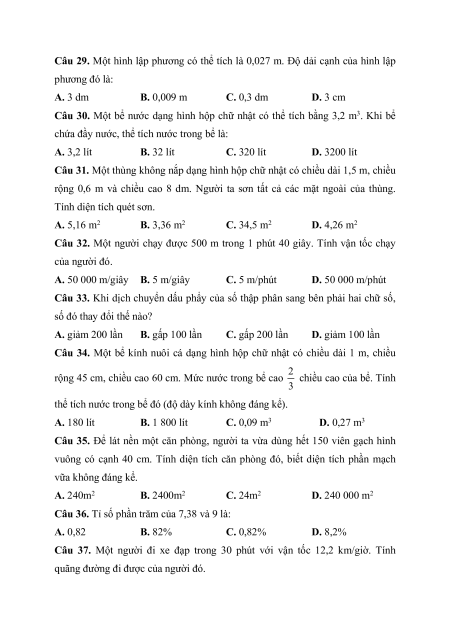 Câu 29. Một hình lập phương có thể tích là 0,027 m. Độ dải cạnh của hình lập phương đó là: A. 3 dm B. 0,009 m C. 0,3 dm D. 3 cm
