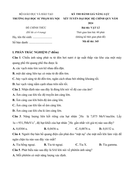 Đề thi Vật lí ĐGNL Đại học Sư phạm Hà Nội năm 2024