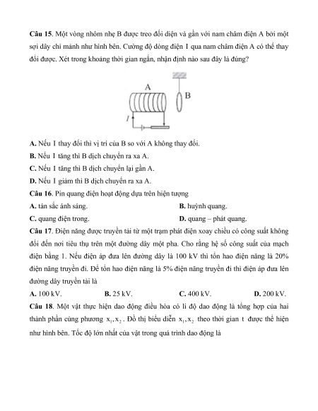 Câu 15. Một vòng nhôm nhẹ B được treo đối diện và gần với nam châm điện A bởi một