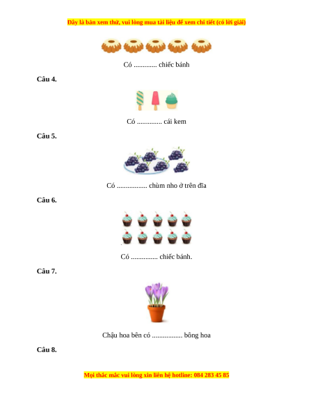 Có ............. chiếc bánh Câu 4. Có .............. cái kem Câu 5.