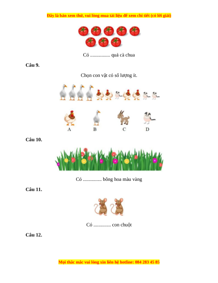 Có ............... bông hoa màu vàng Câu 11. Có .............. con chuột Câu 12.