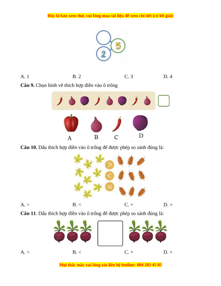 Câu 10. Dấu thích hợp điền vào ô trống để được phép so sánh đúng là: A. > B. < C. + D. =