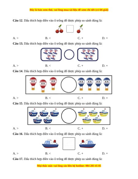 Câu 17. Dấu thích hợp điền vào ô trống để được phép so sánh đúng là: