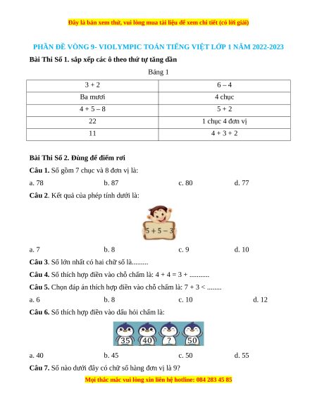 VIOLYMPIC TOÁN TIẾNG VIỆT LỚP 1 NĂM 2022-2023