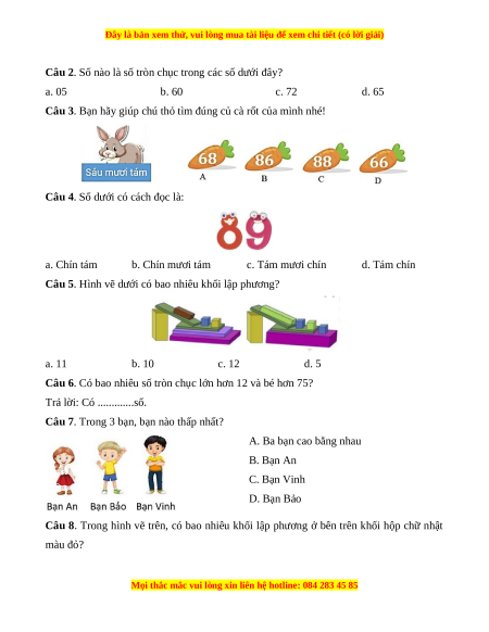 Câu 4. Số dưới có cách đọc là: a. Chín tám b. Chín mươi tám c. Tám mươi chín d. Tám chín