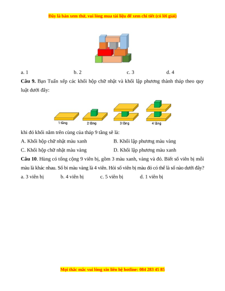 Câu 9. Bạn Tuấn xếp các khối hộp chữ nhật và khối lập phương thành tháp theo quy