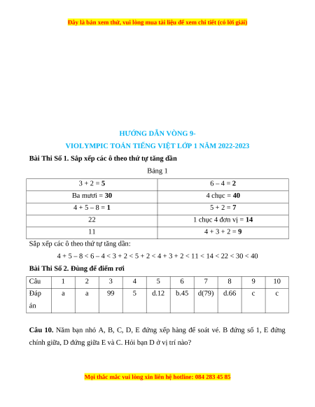 PHẦN ĐỀ VÒNG 9- VIOLYMPIC TOÁN TIẾNG VIỆT LỚP 1 NĂM 2022-2023